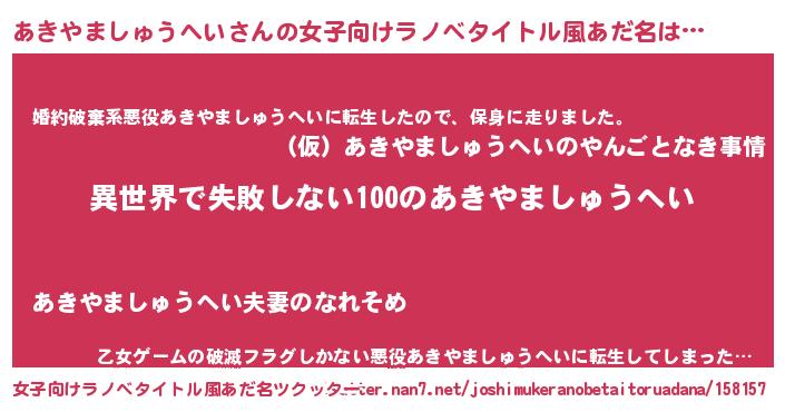 | 男性向けラノベタイトル風あだ名 | 『あきやましゅうへいという概念が存在しない退屈な世界 』 |