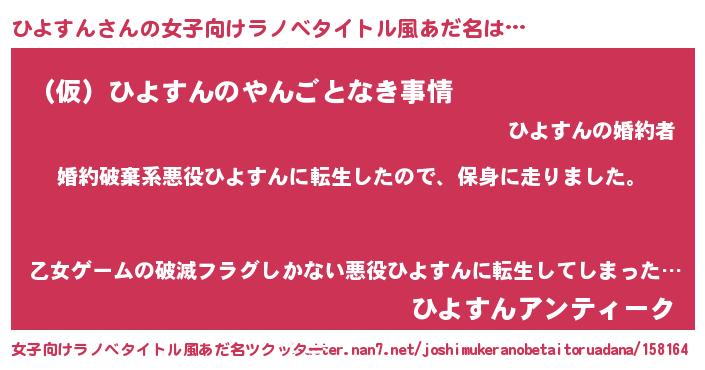| 男性向けラノベタイトル風あだ名 | 『ヒヨスンスレイヤー』『ひよすんの憂鬱』 |