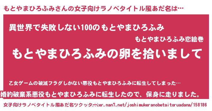 | 男性向けラノベタイトル風あだ名 | 『もとやまひろふみの嫁は女の子じゃないと思った?』 |