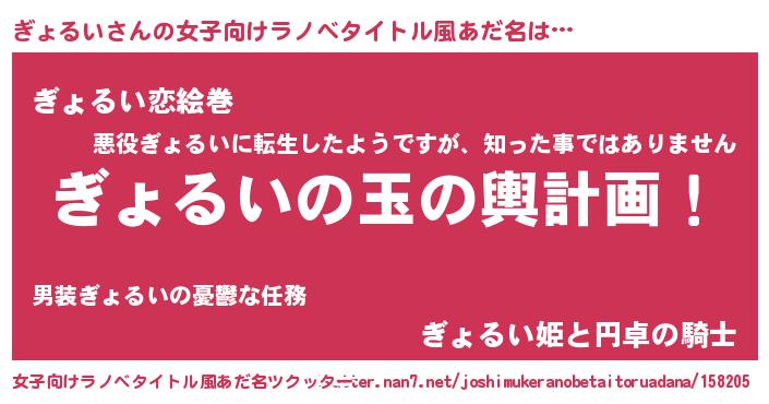 | 男性向けラノベタイトル風あだ名 | 『ぎょるい~年齢イコール彼女いない歴の魔法使い~』 |