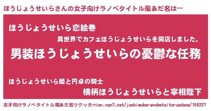 | 男性向けラノベタイトル風あだ名 | 『うちのほうじょうせいらが世界を掌握している!』 |