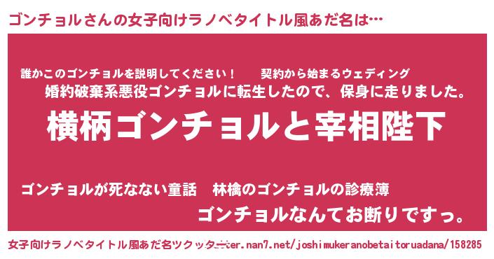 | 男性向けラノベタイトル風あだ名 | 『ゴンチョルに滅ぼされるだけの簡単なお仕事です』 |