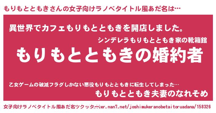 | 男性向けラノベタイトル風あだ名 | 『うちの娘の為ならば、俺はもしかしたらもりもとともきも倒せるかもしれない。』 |