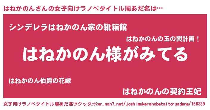 | 男性向けラノベタイトル風あだ名 | 『はねかのんの嫁は女の子じゃないと思った?』 |