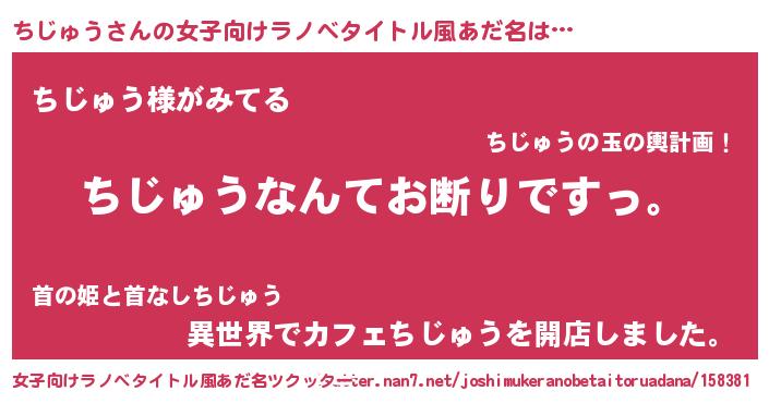 ちじゅうさんの女子向けラノベタイトル風あだ名は… 『ちじゅうなんてお断りですっ。』『ちじゅう様がみてる』『異世界でカフェちじゅうを開店しました。』 ツクッター #女子向けラノベタイトル風あだ名ツクッター http://tkutter.nan7.net/joshimukeranobetaitoruadana/158381/