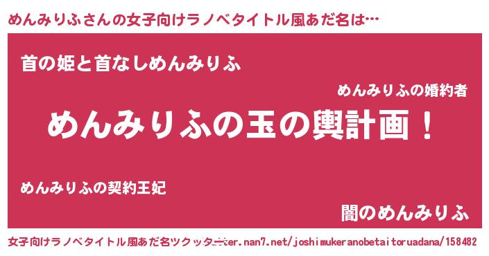 | 男性向けラノベタイトル風あだ名 | 『めんみりふ~年齢イコール彼女いない歴の魔法使い~』 |