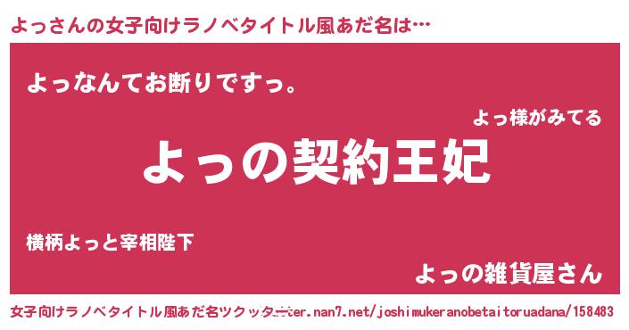 よっさんの女子向けラノベタイトル風あだ名は… 『よっの契約王妃』『よっなんてお断りですっ。』『よっの雑貨屋さん』 ツクッター #女子向けラノベタイトル風あだ名ツクッター http://tkutter.nan7.net/joshimukeranobetaitoruadana/158483/