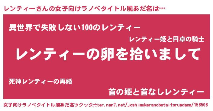 | 男性向けラノベタイトル風あだ名 | 『レンティーの嫁は女の子じゃないと思った?』 |