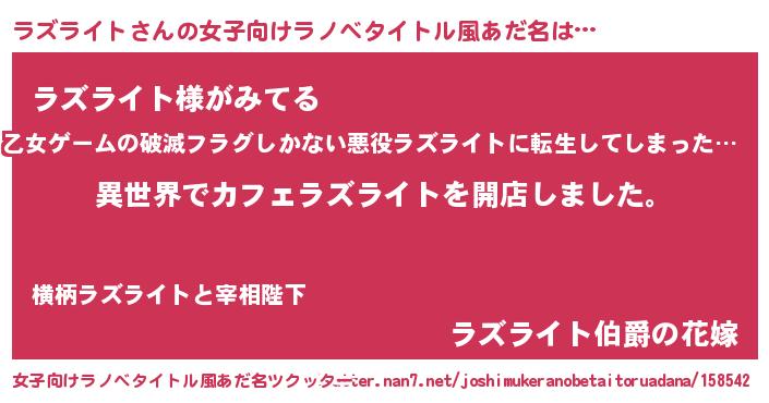 | 男性向けラノベタイトル風あだ名 | 『誰もが恐れるあのラズライトが、ぼくの専属メイドになるようです。』 |