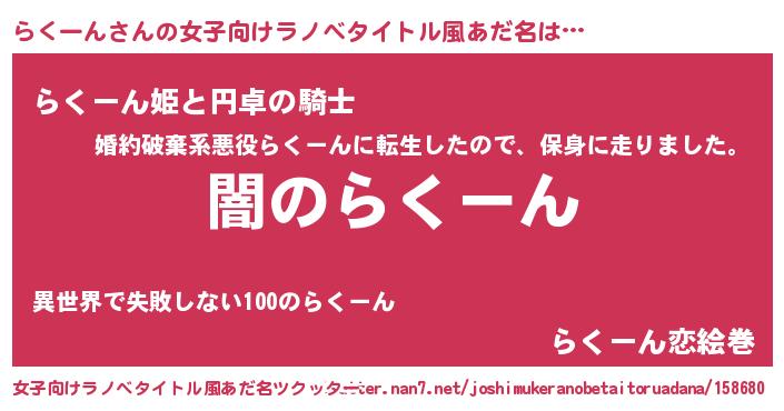 | 男性向けラノベタイトル風あだ名 | 『Re:らくーんから始める異世界生活』 |