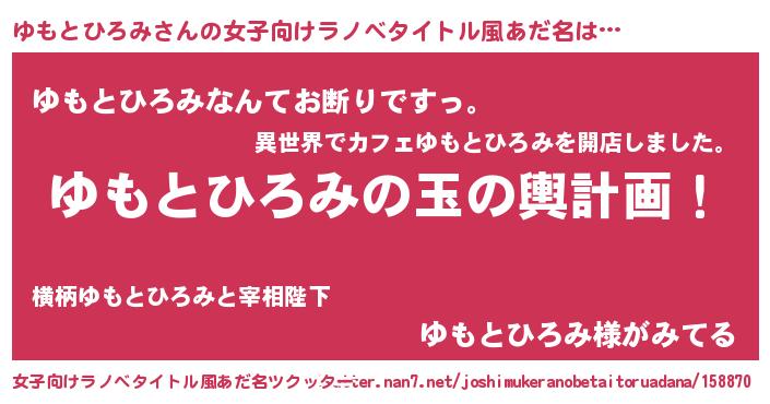 | 男性向けラノベタイトル風あだ名 | 『ゆもとひろみ~年齢イコール彼女いない歴の魔法使い~』 |