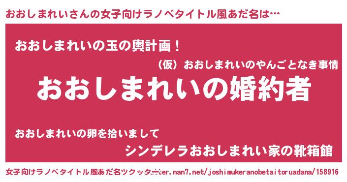 | 男性向けラノベタイトル風あだ名 | 『うちの娘の為ならば、俺はもしかしたらおおしまれいも倒せるかもしれない。』 |