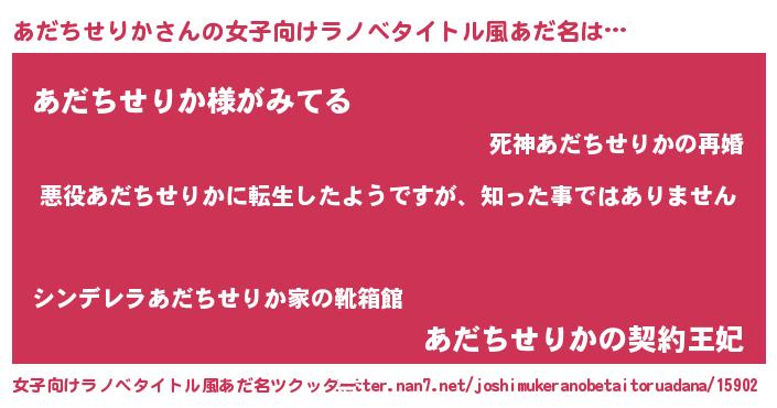 | 男性向けラノベタイトル風あだ名 | 『この素晴らしい世界にあだちせりかを!』 |