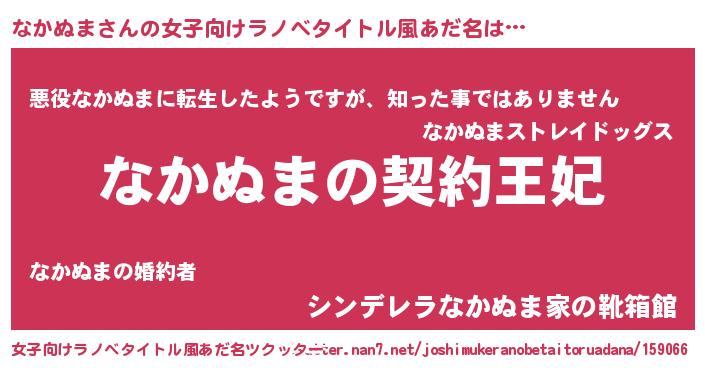 | 男性向けラノベタイトル風あだ名 | 『誰もが恐れるあのなかぬまが、ぼくの専属メイドになるようです。』 |