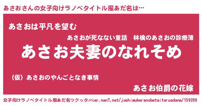 | 男性向けラノベタイトル風あだ名 | 『おまえをオタクにしてやるから、俺をあさおにしてくれ! 』 |