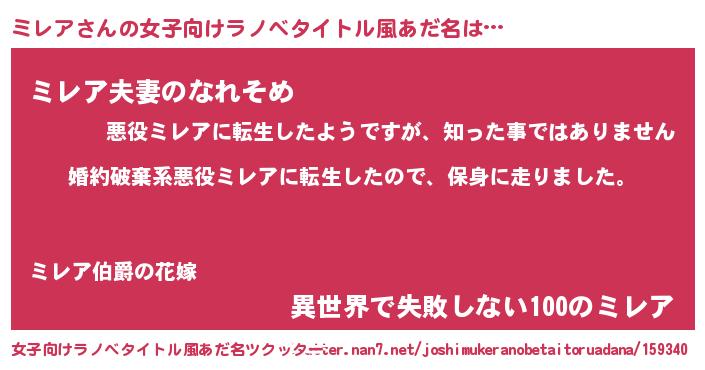 | 男性向けラノベタイトル風あだ名 | 『ミレアスレイヤー』 |
