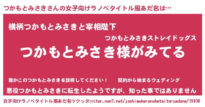 つかもとみさきさんの女子向けラノベタイトル風あだ名は… 『つかもとみさき様がみてる』『横柄つかもとみさきと宰相陛下』『悪役つかもとみさきに転生したようですが、知った事ではありません』 ツクッター #女子向けラノベタイトル風あだ名ツクッター http://tkutter.nan7.net/joshimukeranobetaitoruadana/15938/