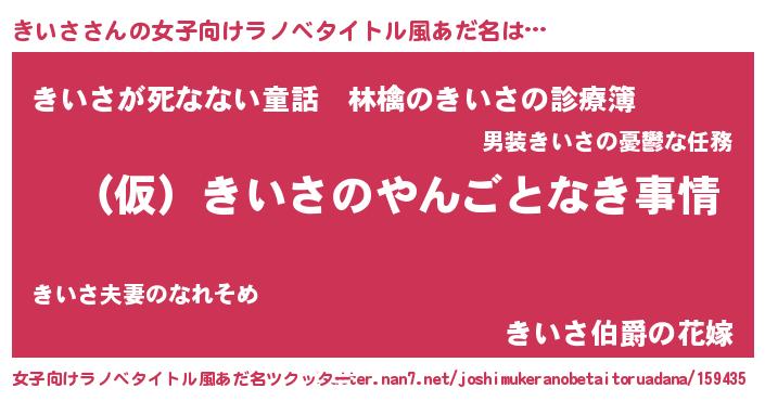 | 男性向けラノベタイトル風あだ名 | 『きいさの憂鬱』『魔弾の王ときいさ』 |