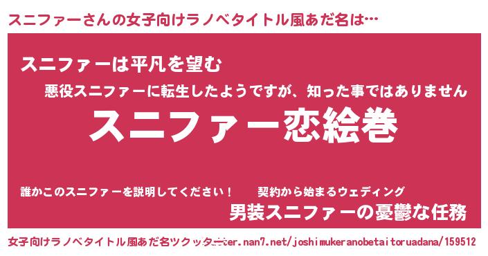 | 男性向けラノベタイトル風あだ名 | 『おまえをオタクにしてやるから、俺をスニファーにしてくれ! 』 |