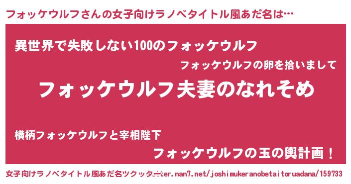 | 男性向けラノベタイトル風あだ名 | 『おまえをオタクにしてやるから、俺をフォッケウルフにしてくれ! 』 |