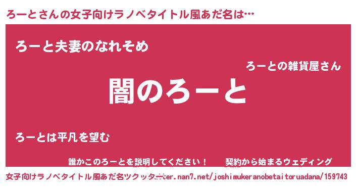 | 男性向けラノベタイトル風あだ名 | 『Re:ろーとから始める異世界生活』 |