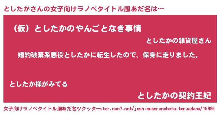 | 男性向けラノベタイトル風あだ名 | 『トシタカスレイヤー』『としたかの憂鬱』 |