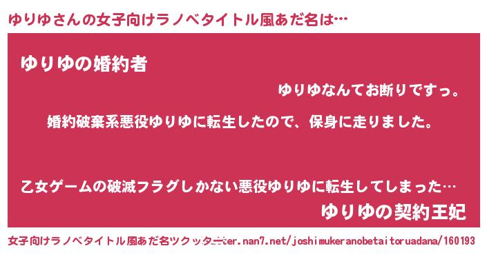 ゆりゆさんの女子向けラノベタイトル風あだ名は… 『婚約破棄系悪役ゆりゆに転生したので、保身に走りました。』『ゆりゆの婚約者』『ゆりゆの契約王妃』 ツクッター #女子向けラノベタイトル風あだ名ツクッター http://tkutter.nan7.net/joshimukeranobetaitoruadana/160193/