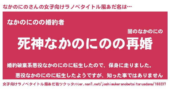 なかのにのさんの女子向けラノベタイトル風あだ名は… 『死神なかのにのの再婚』『なかのにのの婚約者』『悪役なかのにのに転生したようですが、知った事ではありません』 ツクッター #女子向けラノベタイトル風あだ名ツクッター http://tkutter.nan7.net/joshimukeranobetaitoruadana/160237/
