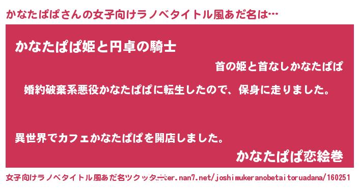 | 胡散臭い通販商品みたいなあだ名 | 『必ず成功するブレスレット…その名も「かなたぱぱ」』 |