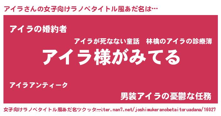 | 男性向けラノベタイトル風あだ名 | 『アイラの嫁は女の子じゃないと思った?』 |