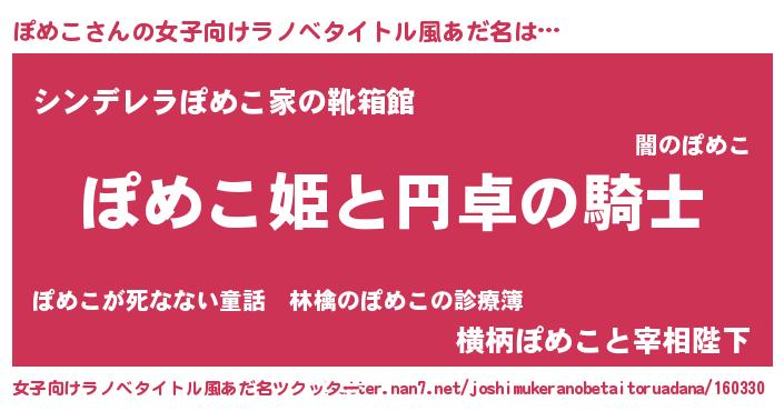 | 男性向けラノベタイトル風あだ名 | 『ぽめこの憂鬱』『魔弾の王とぽめこ』 |