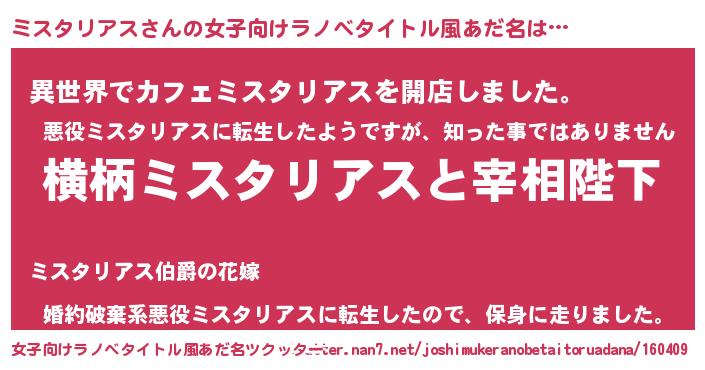 | 男性向けラノベタイトル風あだ名 | 『ミスタリアスに滅ぼされるだけの簡単なお仕事です』 |