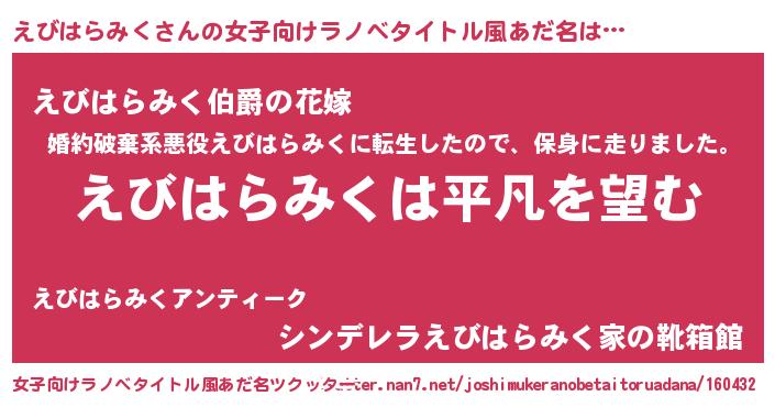| 胡散臭い通販商品みたいなあだ名 | 『信頼と実績のサプリメント…その名も「えびはらみく」』 |