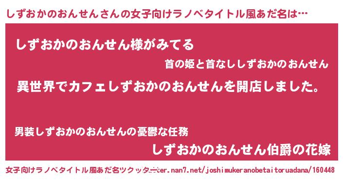 | 男性向けラノベタイトル風あだ名 | 『誰もが恐れるあのしずおかのおんせんが、ぼくの専属メイドになるようです。』 |