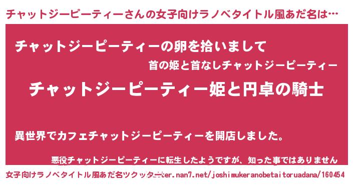 | 男性向けラノベタイトル風あだ名 | 『チャットジーピーティーの憂鬱』 |