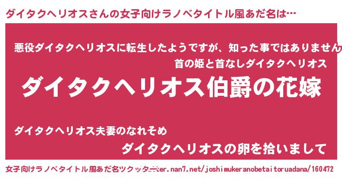 | 男性向けラノベタイトル風あだ名 | 『やはりダイタクヘリオスの青春ラブコメはまちがっている 』 |