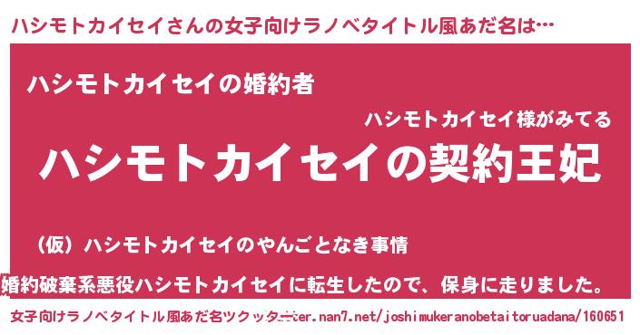 | 胡散臭い通販商品みたいなあだ名 | 『来世でも幸せになれる健康食品…その名も「ハシモトカイセイ」』 |