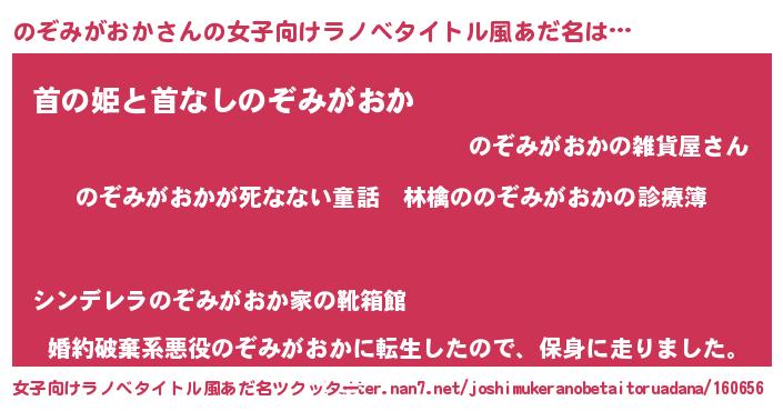 | 男性向けラノベタイトル風あだ名 | 『魔弾の王とのぞみがおか』 |