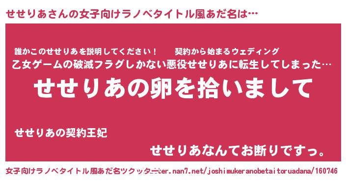 | 男性向けラノベタイトル風あだ名 | 『せせりあの嫁は女の子じゃないと思った?』 |
