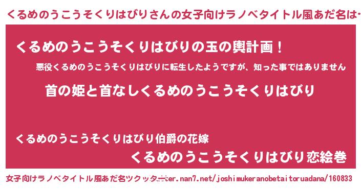 | 男性向けラノベタイトル風あだ名 | 『はたらくくるめのうこうそくりはびりさま!』 |