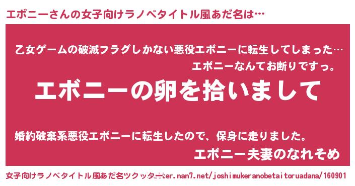 | 男性向けラノベタイトル風あだ名 | 『エボニーの嫁は女の子じゃないと思った?』 |