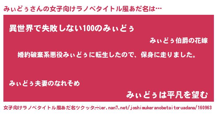 | 男性向けラノベタイトル風あだ名 | 『転生したらみぃどぅだった件』 |