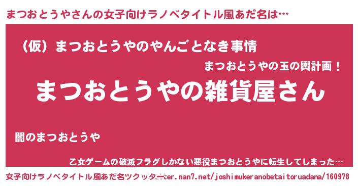 | 男性向けラノベタイトル風あだ名 | 『やはりまつおとうやの青春ラブコメはまちがっている 』 |