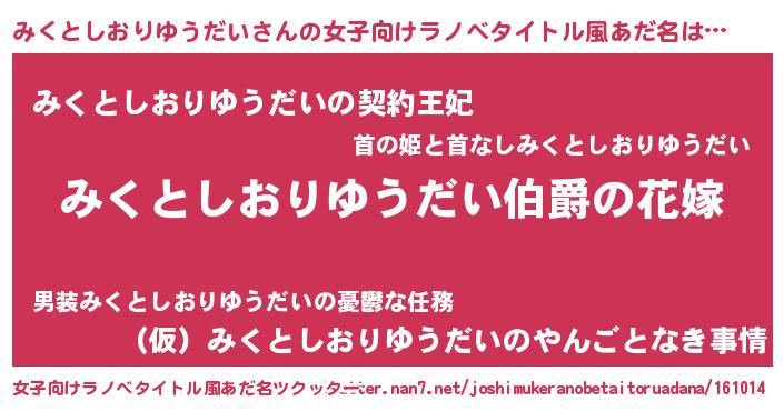 | 胡散臭い通販商品みたいなあだ名 | 『世界が平和になる高級そうな皿…その名も「みくとしおりゆうだい」』 |