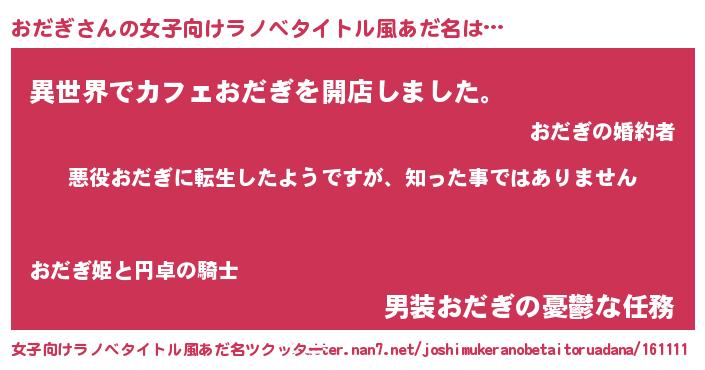 | 男性向けラノベタイトル風あだ名 | 『この素晴らしい世界におだぎを!』 |