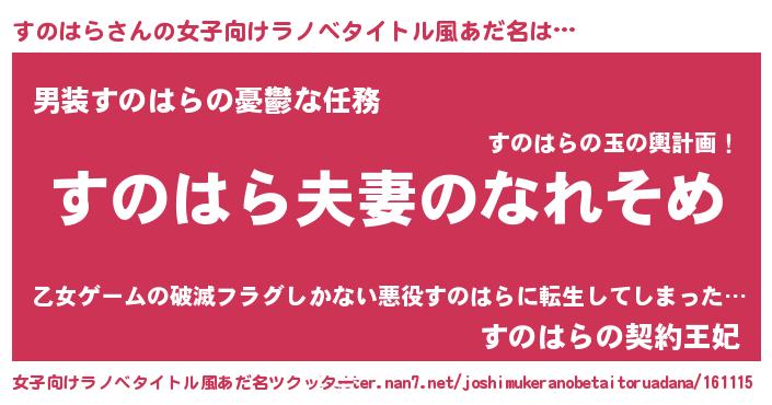 すのはらさんの女子向けラノベタイトル風あだ名は… 『すのはら夫妻のなれそめ』『男装すのはらの憂鬱な任務』『すのはらの契約王妃』 ツクッター #女子向けラノベタイトル風あだ名ツクッター http://tkutter.nan7.net/joshimukeranobetaitoruadana/161115/