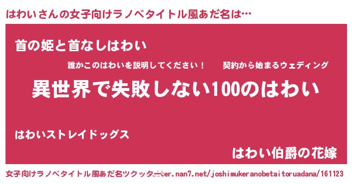 | 男性向けラノベタイトル風あだ名 | 『はわいという概念が存在しない退屈な世界 』 |