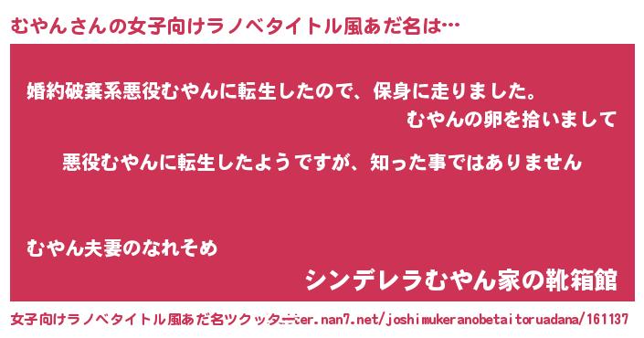 | 男性向けラノベタイトル風あだ名 | 『この素晴らしい世界にむやんを!』 |