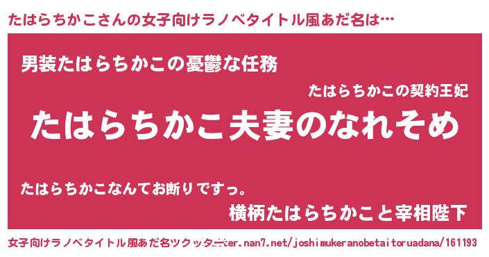 | 男性向けラノベタイトル風あだ名 | 『おまえをオタクにしてやるから、俺をたはらちかこにしてくれ! 』 |