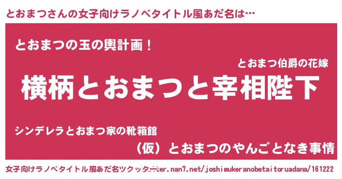 | 男性向けラノベタイトル風あだ名 | 『とおまつに滅ぼされるだけの簡単なお仕事です』 |